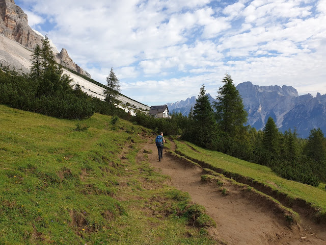 Il programma di oggi, pensato con Francesco, era molto più ambizioso: salire direttamente sulla cima del Monte Pelmo. In realtà quando siamo arrivati al Rif. Venezia, l'ora tarda (le 9.30 del mattino) e le previsioni meteo in peggioramento, ci hanno portato a cambiare idea ed ad accontentarci del solito ma sempre bello "anello del Pelmo". In realtà, come spesso accade, il meteo si è fatto beffe di noi: la giornata è rimasta molto bella e calda fino al tardo pomeriggio, regalandoci in compenso scorci e panorami stupefacenti.
